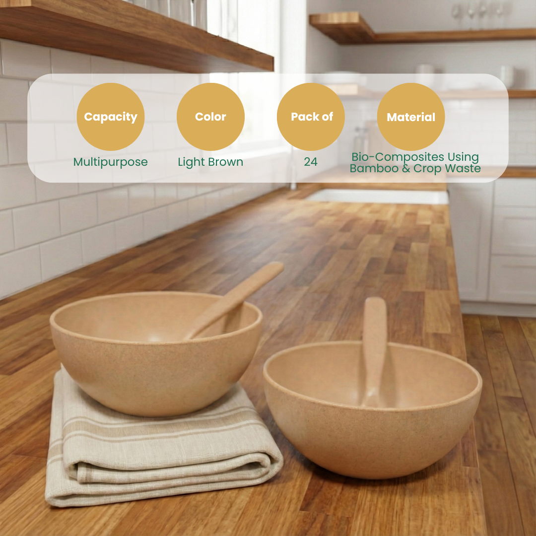 Brand Pacing Grass Recommended Uses For the Product Serving all types of food and beverages Colour Sandy Brown Shape Round Special Feature Bio Composite, Leak Resistant, Microwave Safe, Reusable Occasion Anniversary, Engagement, New Year, Wedding Pattern Solid Enclosure Material Biocomposites made with bamboo fibers, rice husk, coffee husk Item Type Name Bamboo Bowls Included Components 12 Nos. 750ML Bamboo Bowls + 12 Spoon Product Care Instructions Avoid direct contact with fire and excess heat Is Dishwasher Safe Yes Unit Count 24 count