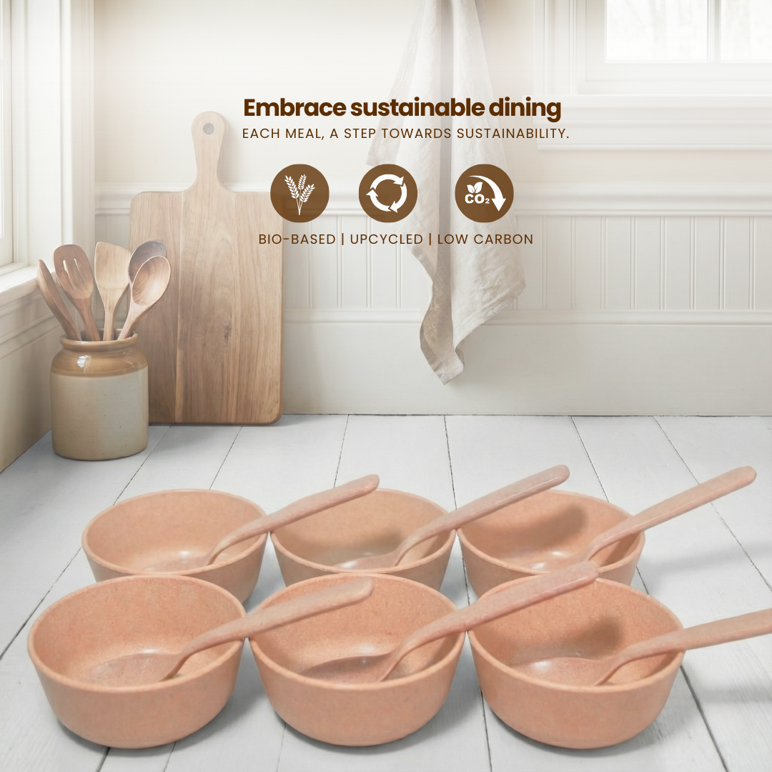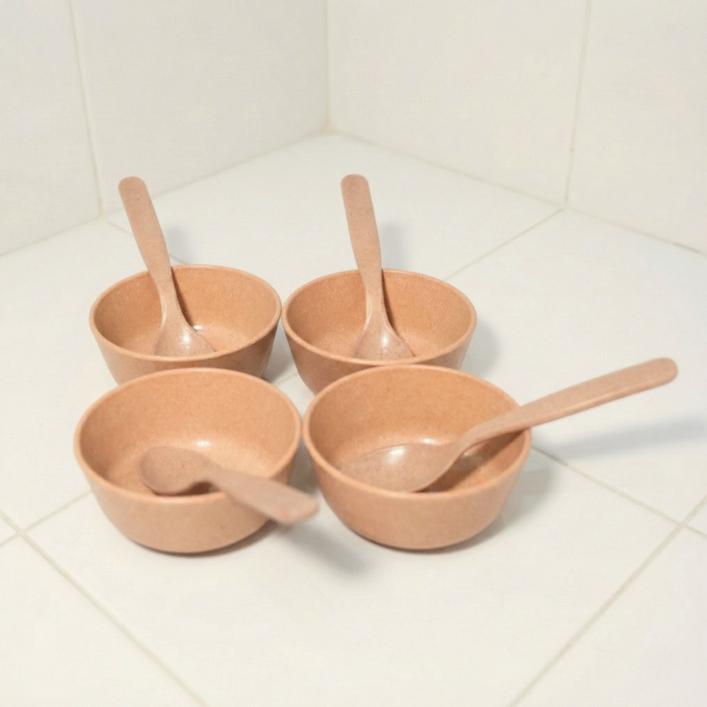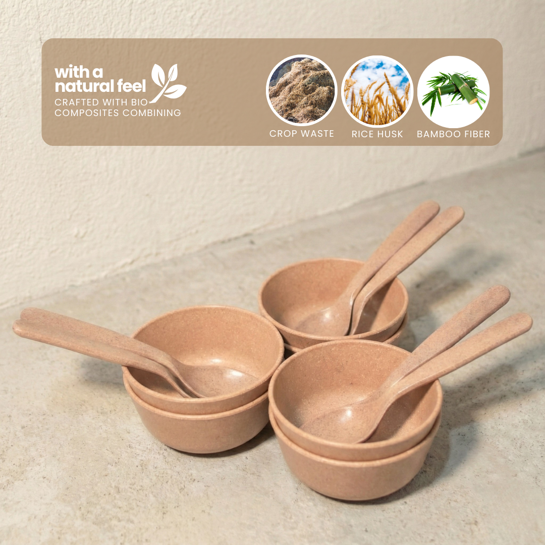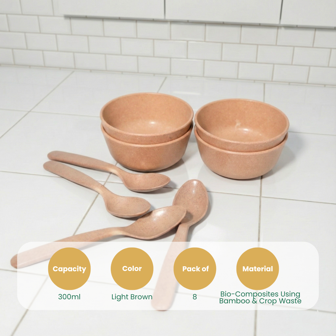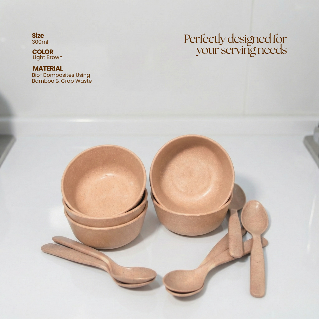 4 Bamboo Soup Bowls & Spoons Set, 300ml Microwave Safe