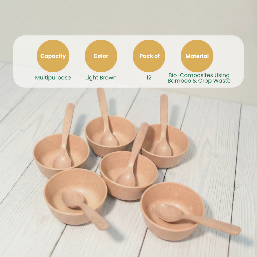 Brand Pacing Grass Recommended Uses For the Product Serving all types of food and beverages Colour Sandy Brown Shape Round Special Feature Bio Composite, Leak Resistant, Microwave Safe, Reusable Occasion Anniversary, Engagement, New Year, Wedding Pattern Solid Enclosure Material Biocomposites made with bamboo fibers, rice husk, coffee husk Item Type Name Bamboo Bowls Included Components 6 Nos. 300ML Bamboo Bowls + 6 Spoon Product Care Instructions Avoid direct contact with fire and excess heat Is Dishwasher Safe Yes Unit Count 12 count