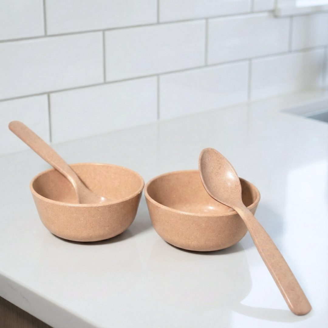 4 Bamboo Soup Bowls & Spoons Set, 300ml Microwave Safe