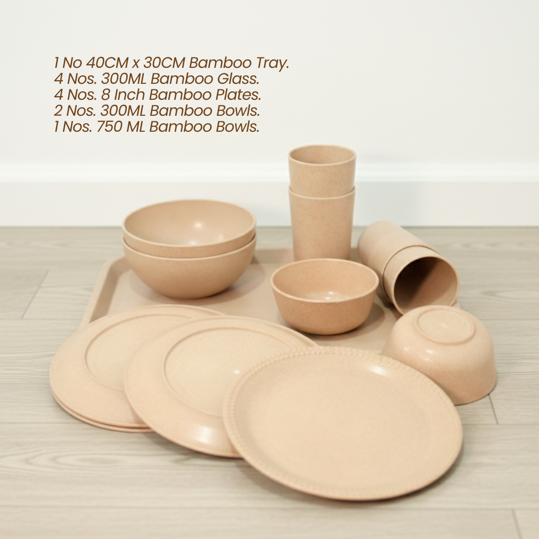 • Package Includes: 1 No 40CM x 30CM Bamboo Tray. 4 Nos. 300ML Bamboo Glass. 4 Nos. 8 Inch Bamboo Plate. 2 Nos. 300ML Bamboo Bowls. 1 Nos. 750 ML Bamboo Bowls.